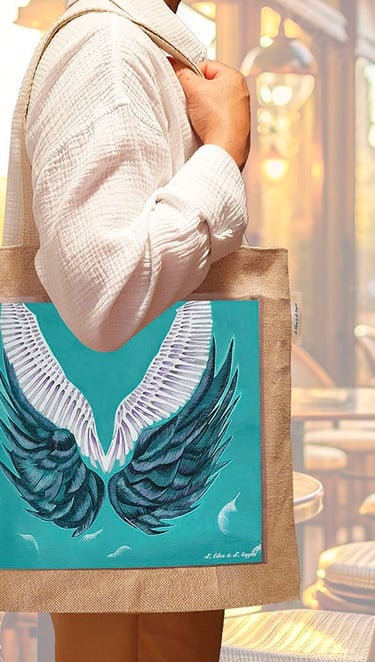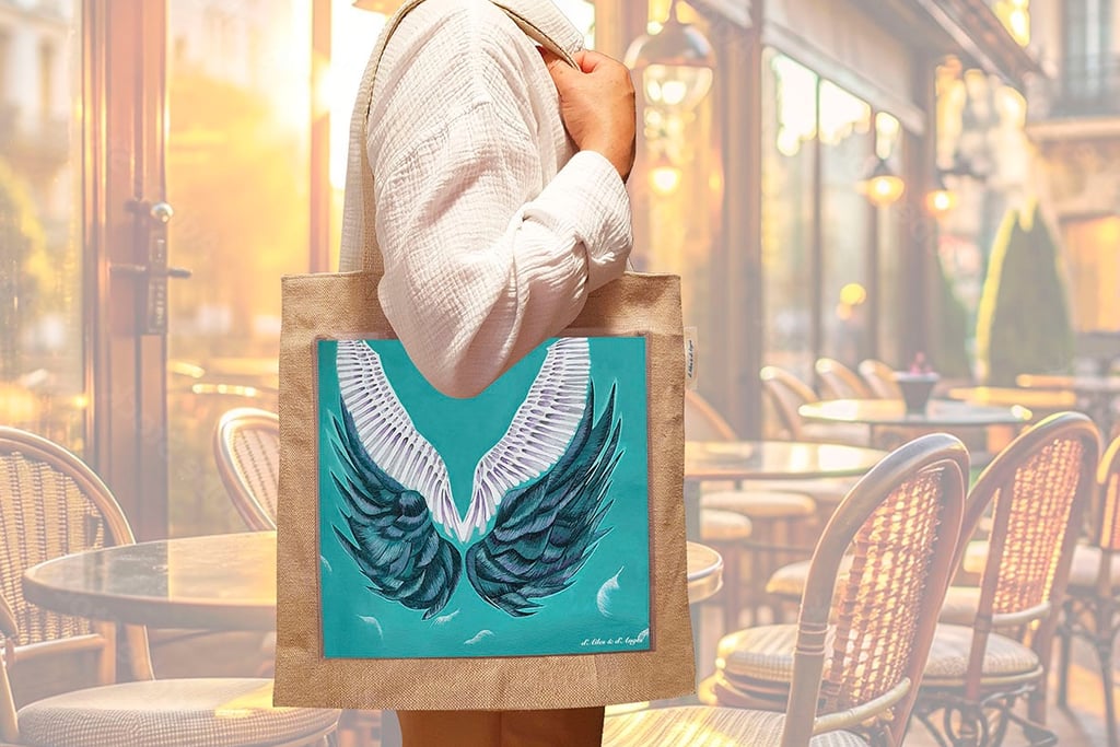 16 x 17 cm. Pochette extérieure de 30 x 30 cm en toile cirée, munie d'un rabat dans laquelle est insérée une toile imprimée Canvas.