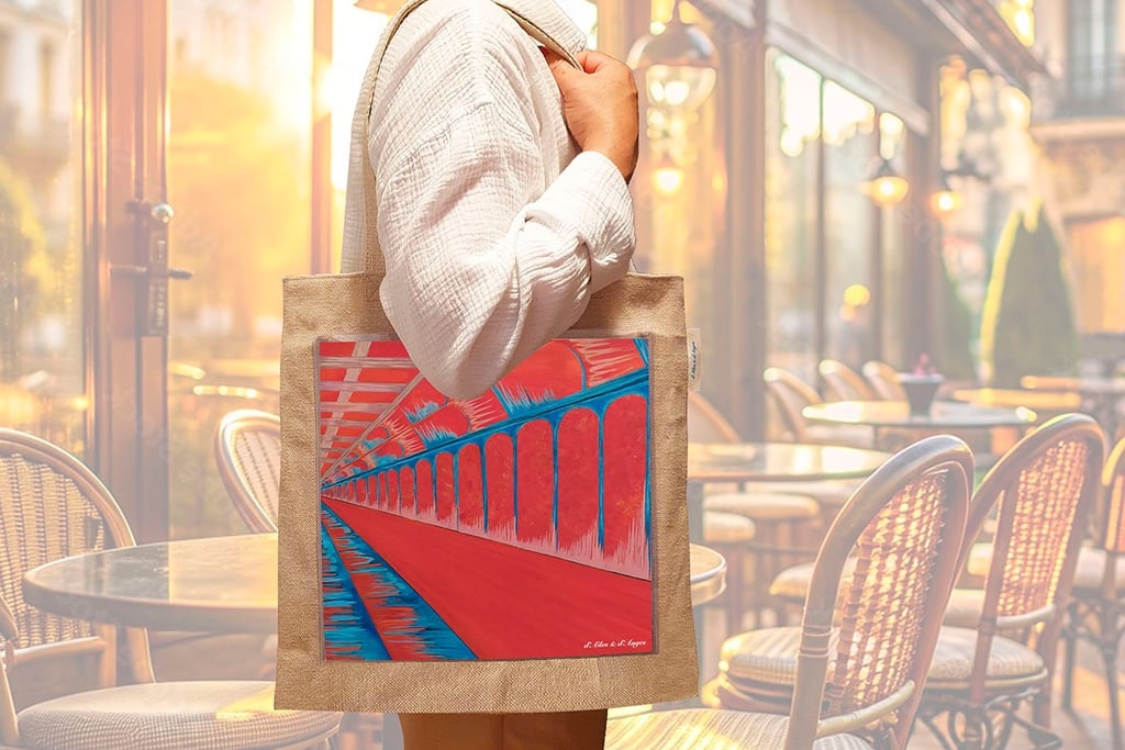 16 x 17 cm. Pochette extérieure de 30 x 30 cm en toile cirée, munie d'un rabat dans laquelle est insérée une toile imprimée Canvas.