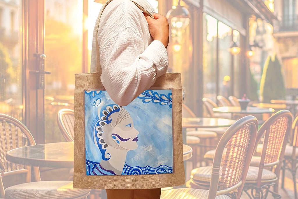 16 x 17 cm. Pochette extérieure de 30 x 30 cm en toile cirée, munie d'un rabat dans laquelle est insérée une toile imprimée Canvas.