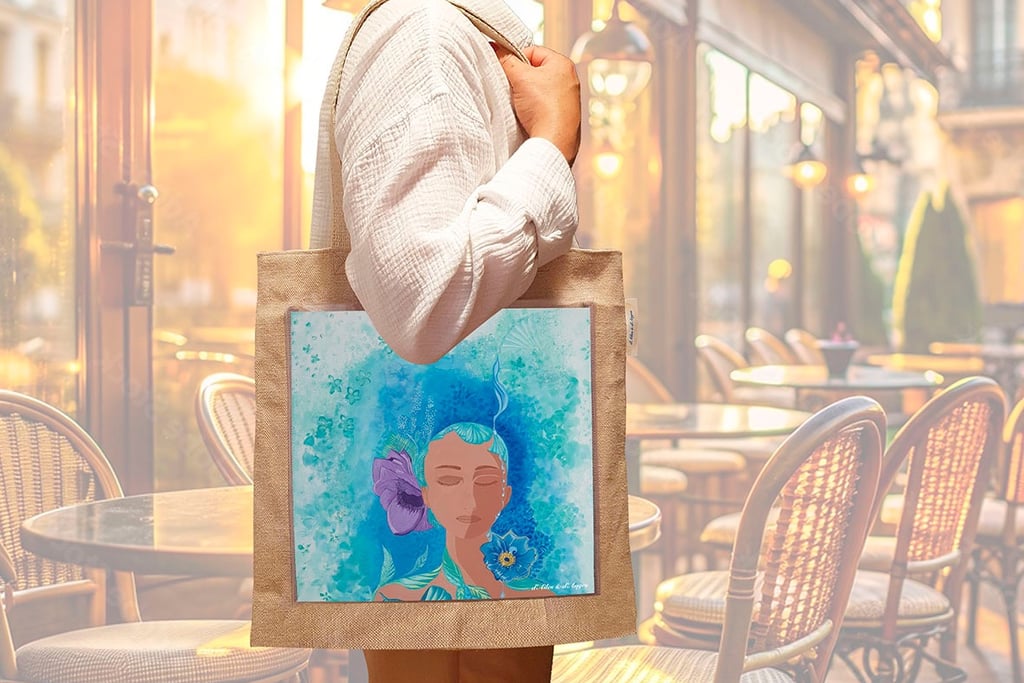 16 x 17 cm. Pochette extérieure de 30 x 30 cm en toile cirée, munie d'un rabat dans laquelle est insérée une toile imprimée Canvas.